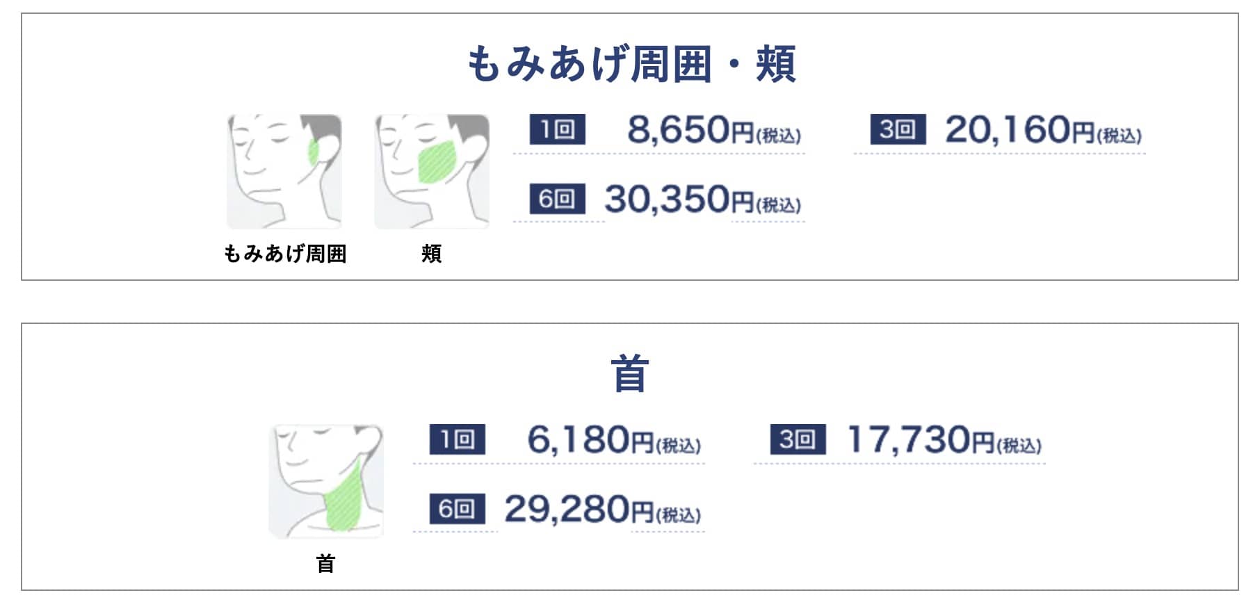 | 税込価格 | ほほ・もみあげ6回 | 首6回 |