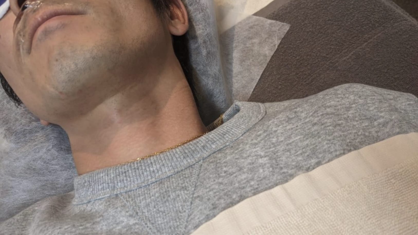 ヒゲレーザー脱毛後にアイスノンで口元を冷やしている様子