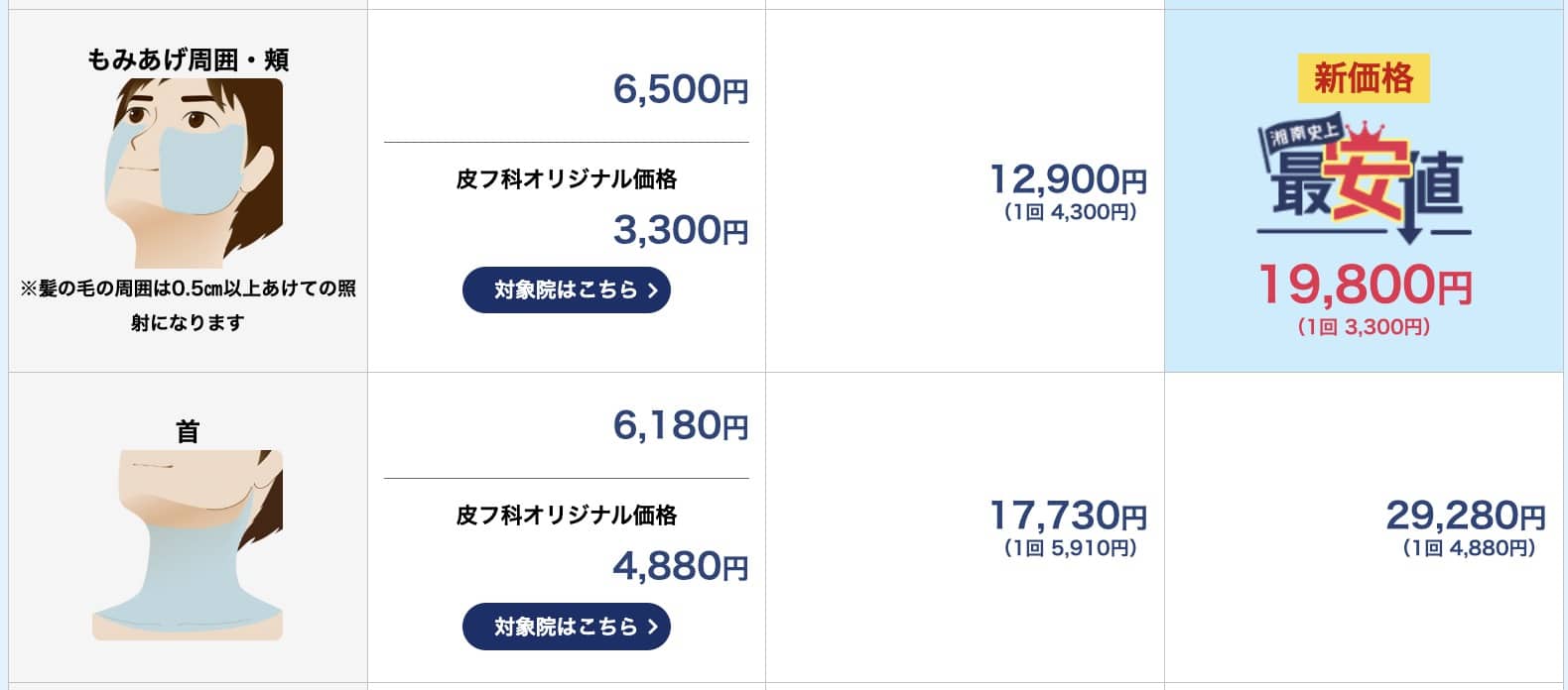 湘南美容クリニックの場合、基本の3部位(鼻下・アゴ・アゴ下)6回コースが16,800円です。