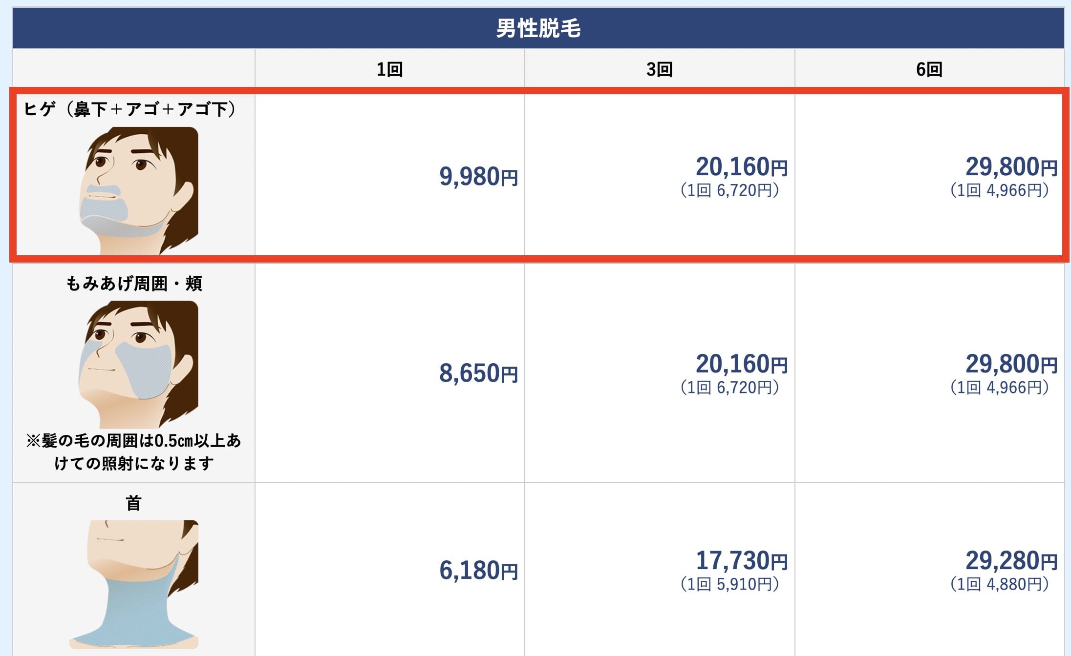 鼻下+アゴ+アゴ下の3ヶ所6回コース:16,800円