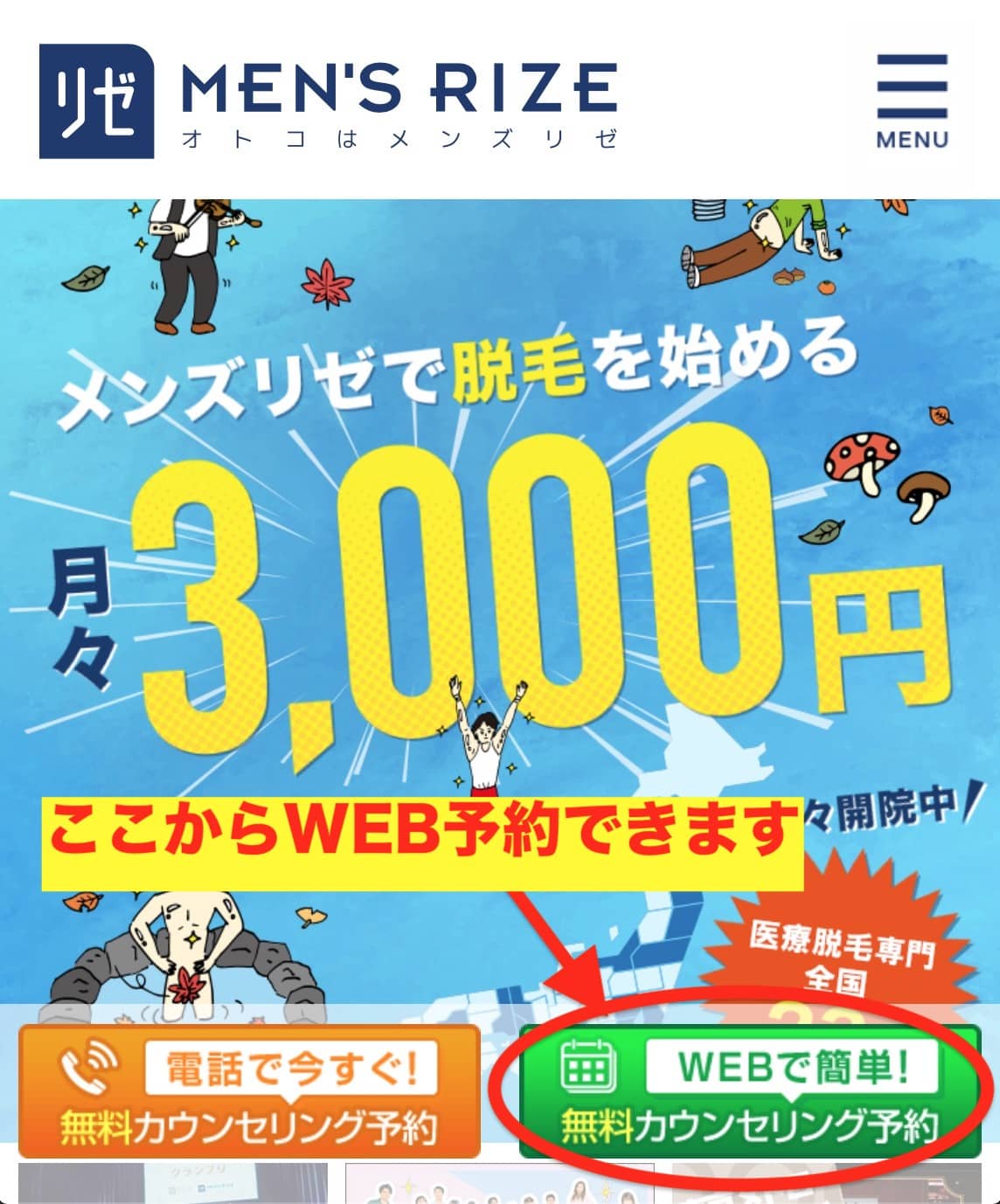 まずは、メンズリゼの公式ホームページから、無料カウンセリングのWEB予約。