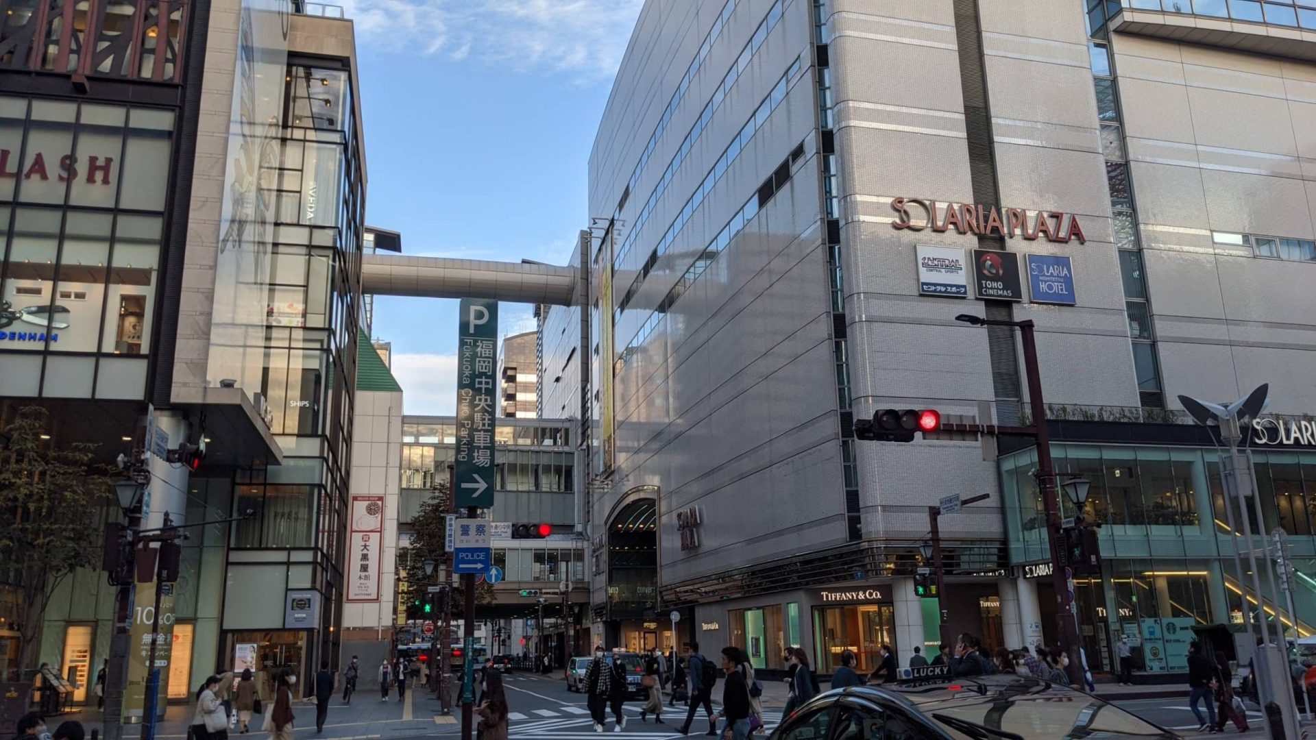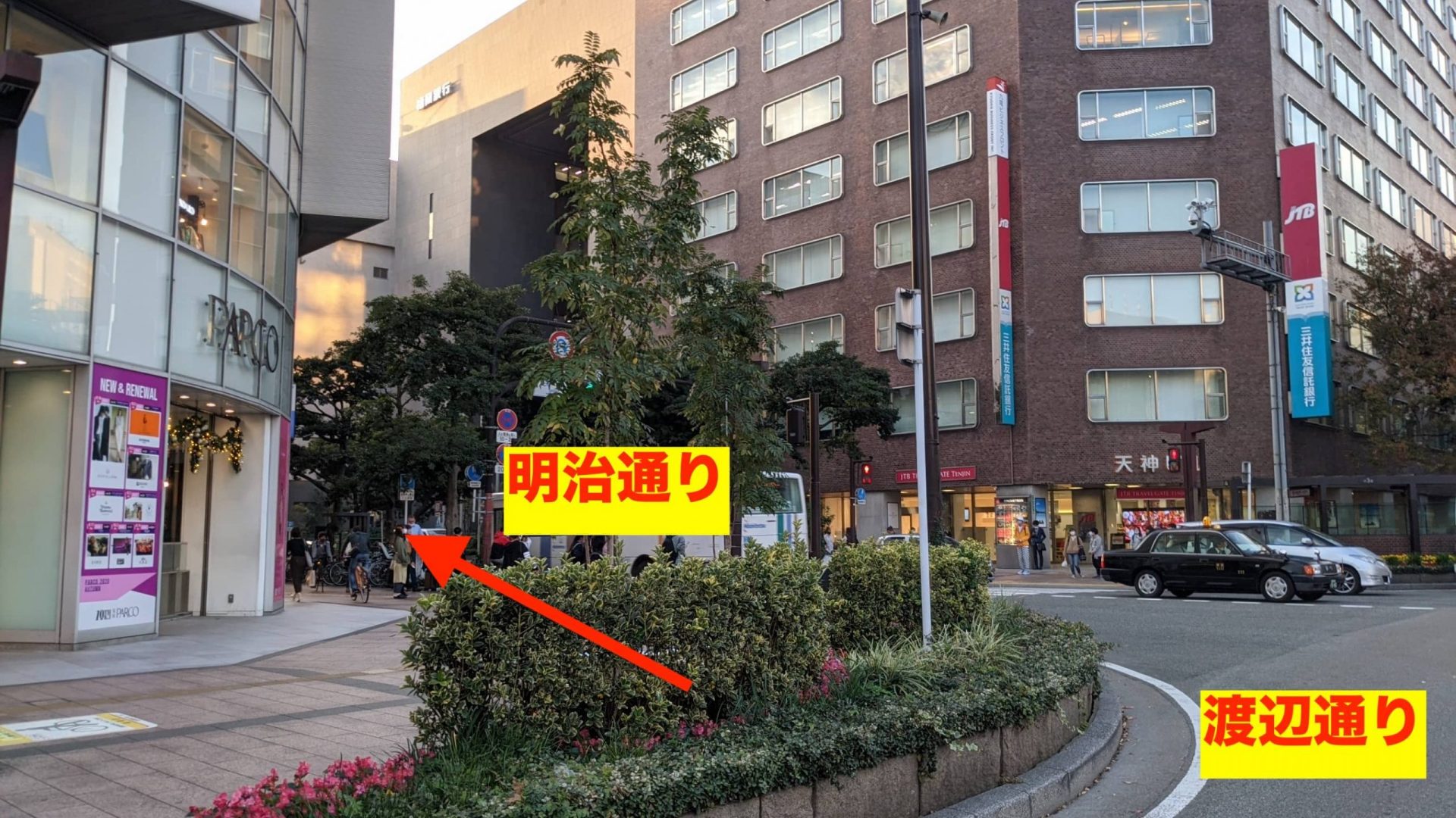 明治通りと渡辺通りが交差する、パルコの交差点を、大名方面へと進みます。