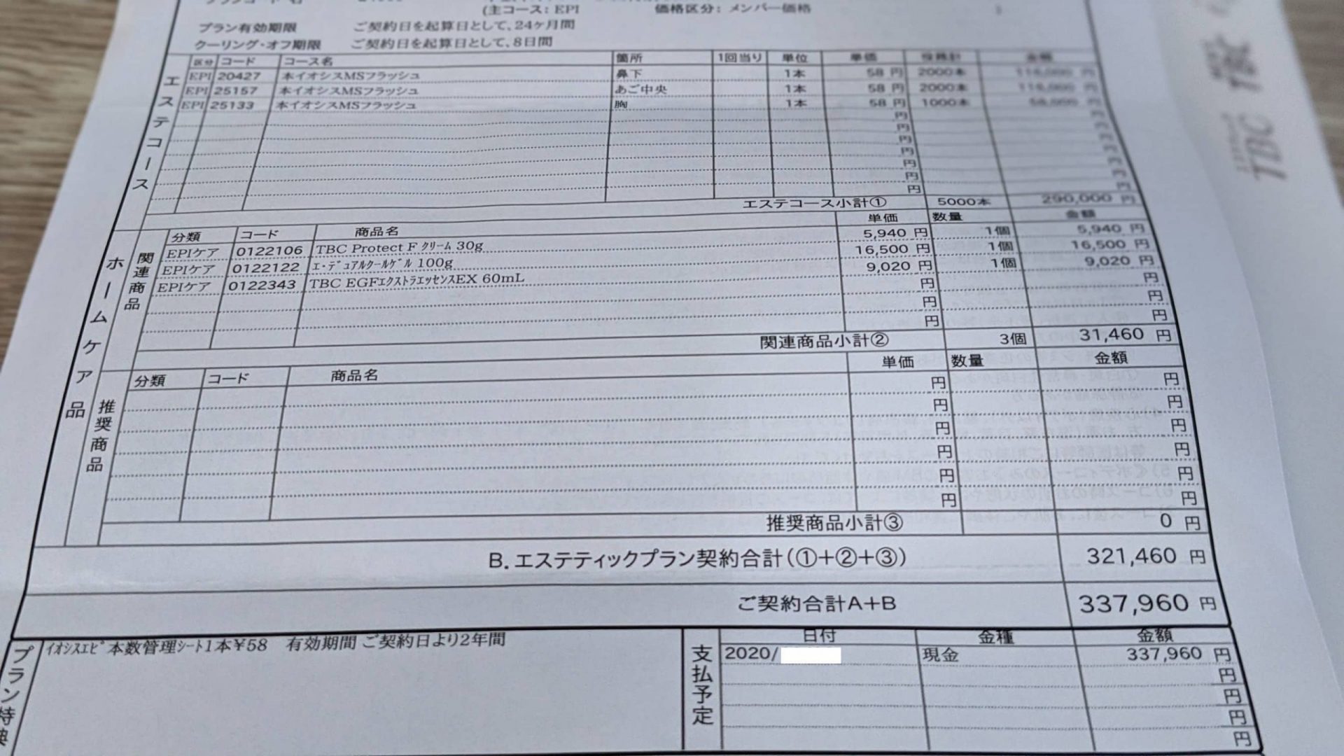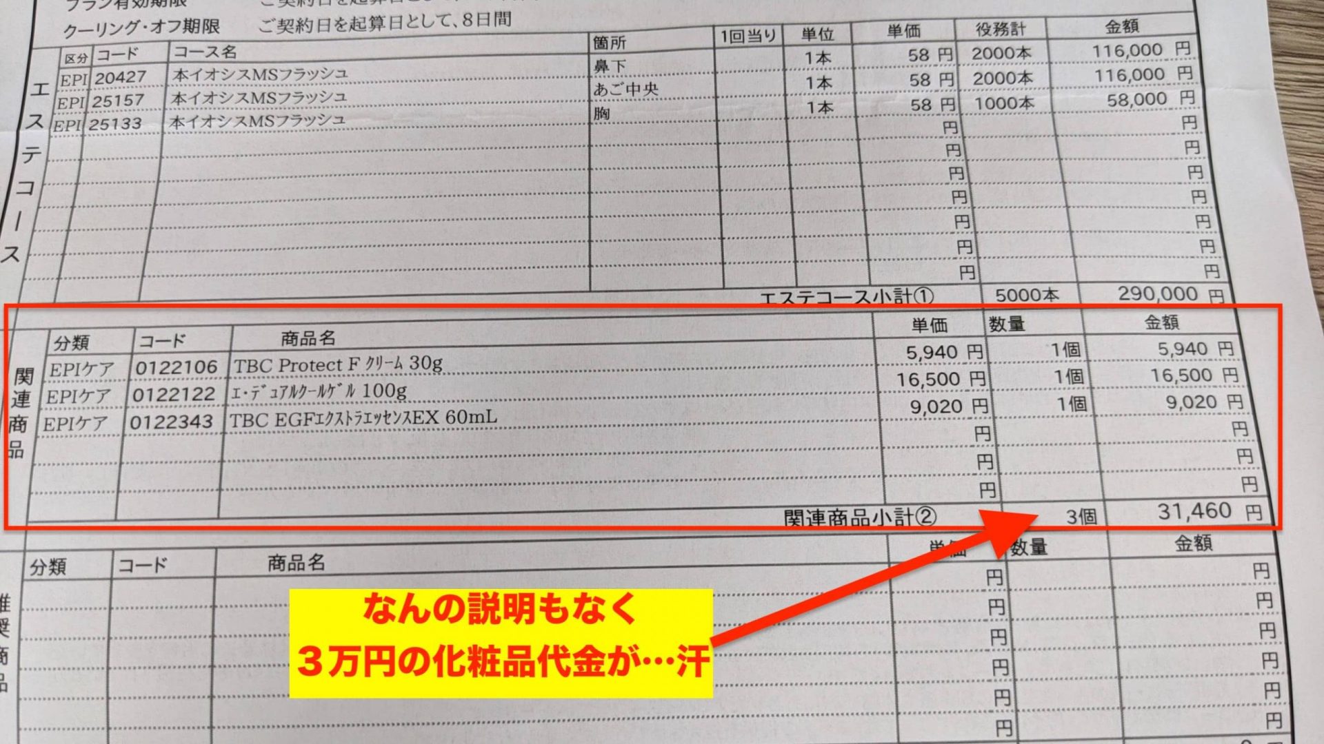施術代は30万円以内に収まっているものの、なぜか謎の化粧品たちが3万円以上勝手に上乗せされている…ww