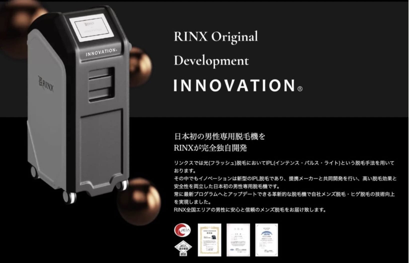「INNOVATION」という、リンクスが国内光学メーカーと共同で開発したオリジナル脱毛機器。