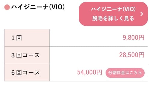 VIO女性の通常料金6回コース:54,000円から5,400円オフ。