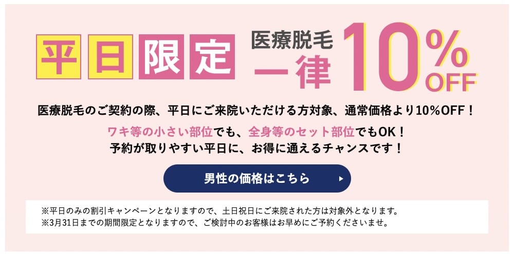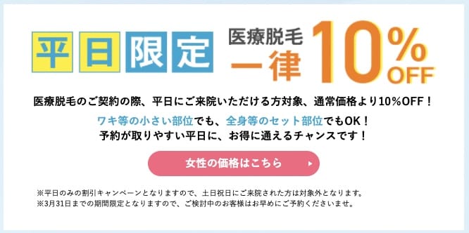 湘南美容クリニックの医療脱毛、平日に契約すれば10%オフ【3月31日まで】